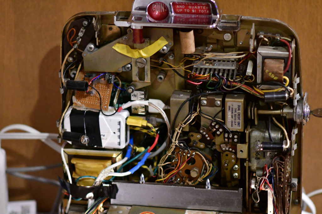 If you want to make a self contained unit, remove the coin box from the lower right backhand side, and remove the coin rejector unit. A working coin rejector unit can fetch you about $30 on ebay, so don’t trash it! Now you have lots of empty space, I placed my 25V Ac transformer in the coin rejector area, topped with a 110V to USB adapter, and the raspberry pi in front of that. It all fits pretty well. You can figure out how your particular parts fit best.